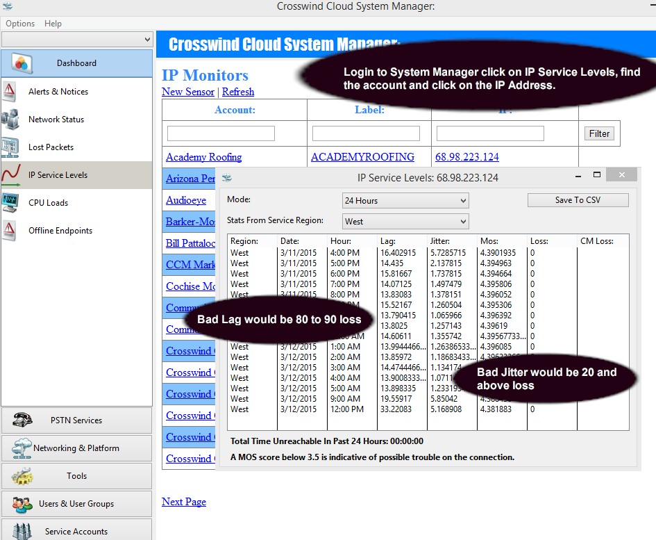 First you will want to check the Managers Dashboard for Alerts and Notices. If nothing there then you will need to check the IP Service Levels. Find location and click on the IP address, another window will pop up and you want to check the Jitter, Lag and Loss. Now if these are high you will need to call the internet provider for that customer. When calling the internet provider make sure to go to Technical Support. Explain that we have a mutual customer and that when we check the network we are showing jitter or packet loss or whatever that you see you let the internet provider know. They will do there test and when those are done if they do find and issue and need to send someone out make sure to grab the ticket number from that so that you can log it on the ticket you made in our system that way if anyone else needs to work on that issue all the information is there. If it is not there issue and everything look fine then have them manually restart the phones and at that time if they are still having those issues please escalate to Tier 2.