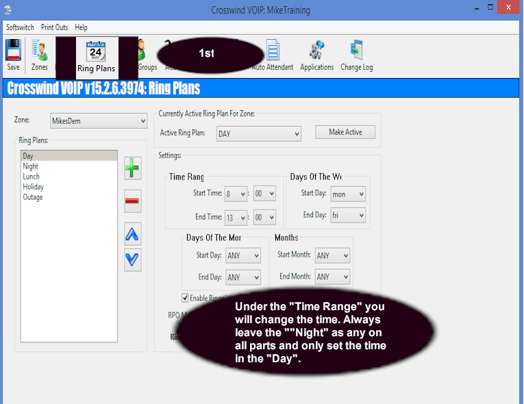 Log into switch and go to Ring Plans. Under the Ring Plan page you need to select the plan that you need to change. Under the Time Range you will change the time. ***We always leave the Night as Any on all parts and only set the time in the Day so this way if you have a Holiday or something special plan that has to be made for a certain day or event time no matter what as long as night is below it in the line up it will roll to that automatically. Save us time to when making changes in Ring Plans***