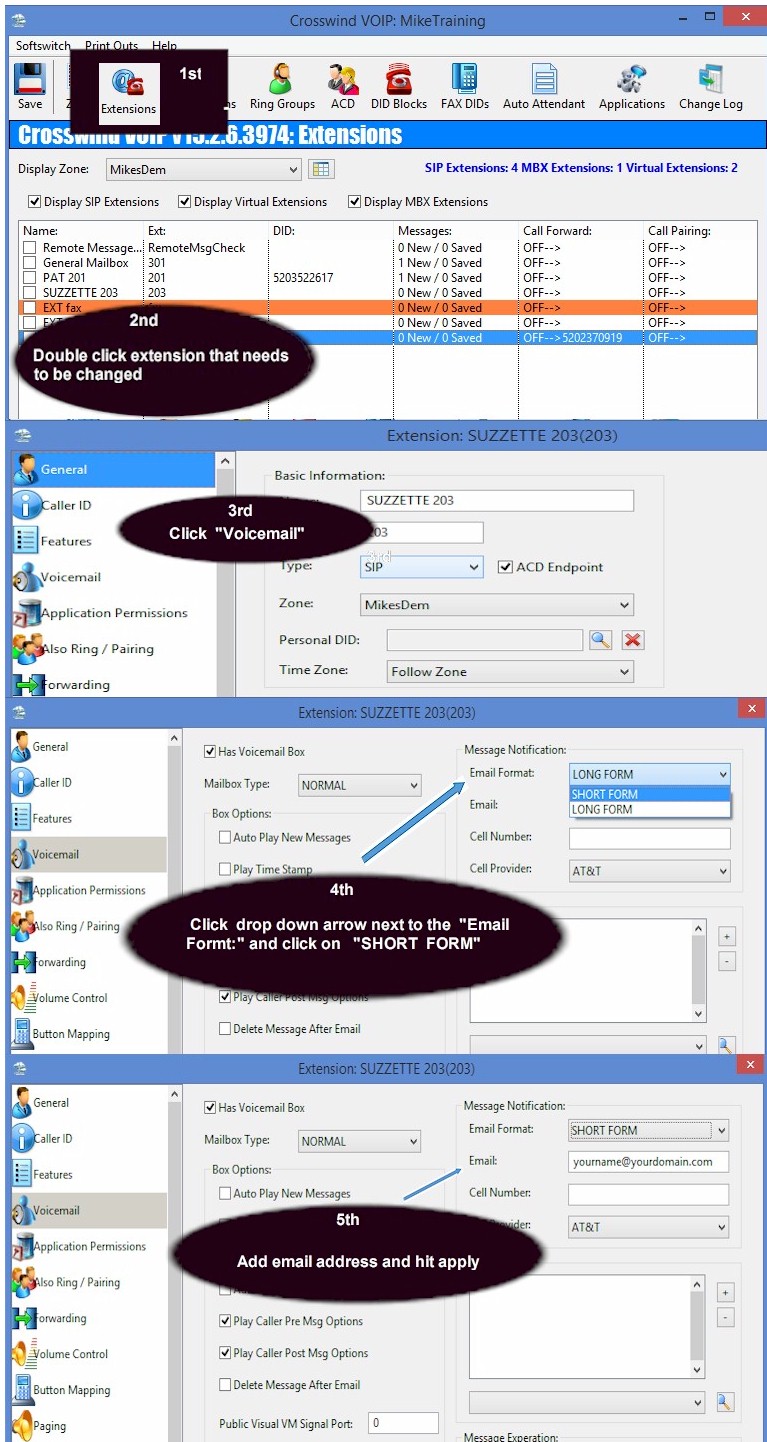 Email alert of a message being left in voicemail February 18, 2015February 20, 2015 rgranillo57 Log into switch and go to Extensions. Go to the Voicemail and set Email Format to the Short form. Then add email address and hit apply Save and make sure to notate the ticket number and what you did. For in-depth over view of extension Share this: Click to share on X (Opens in new window) X Click to share on Facebook (Opens in new window) Facebook Like Loading... Related
