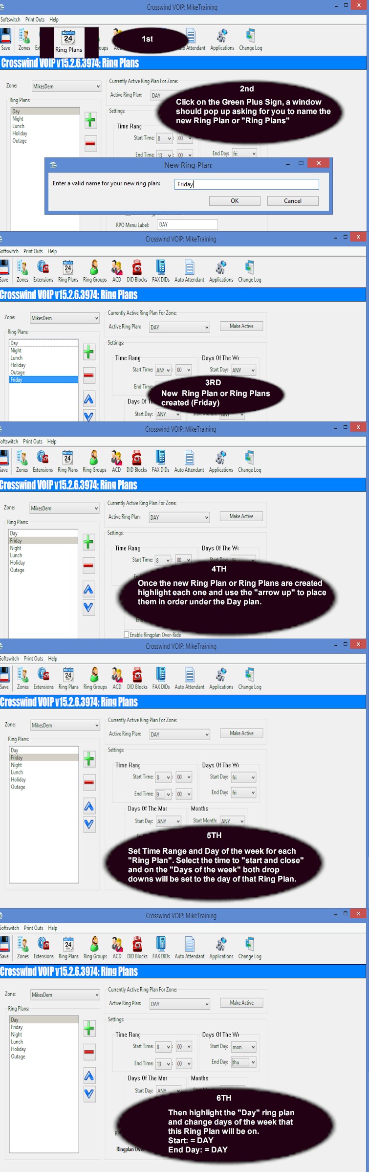Log into the switch and go to Ring Plans. So depending if they do need new ring plans you will need to press the Green Plus Sign to make a new ring plan, name as needed. Always make sure that depending on the days of the week they need to be in order down the line you can use the arrow keys to move the ring plans up or down. Make sure that the night is underneath them and set as ANY in all fields that way no matter what day it will roll over to night depending on what time is set for close.